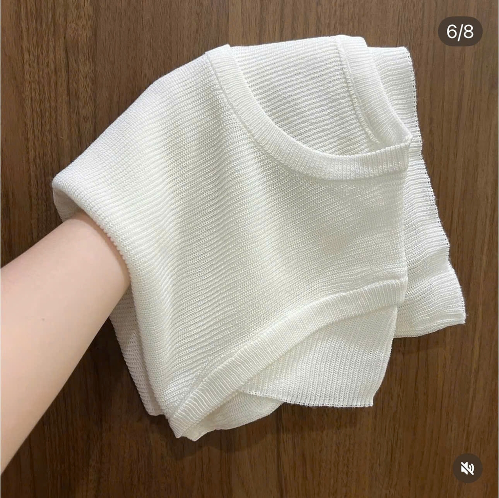 Chiếc ao dệt kim dạng lưới mịn xinh xỉu cả nhà ạ. Với em thì mặc trơn oki nhé, còn ai kín đáo thì thêm áo lá bên trong oki ạ.