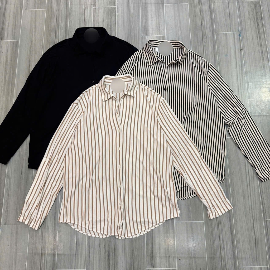 Nó là chất thun cả nhà ạ, thun kiểu pha viscose ấy, nó ko thun hẳn mà cũng ko vải hẳn. Chất này mặc mềm, rũ, và ko nhăn nhé, mấy chế tha hồ mặc. Nút cổ cài hơi rộng, về có thể làm thêm nút bóp nếu ai thích mặc kín đáo đi làm hen, còn style áo này mặc bụi bụi phối đi chơi được lun nhen. Hiệu Primark dư xịn.