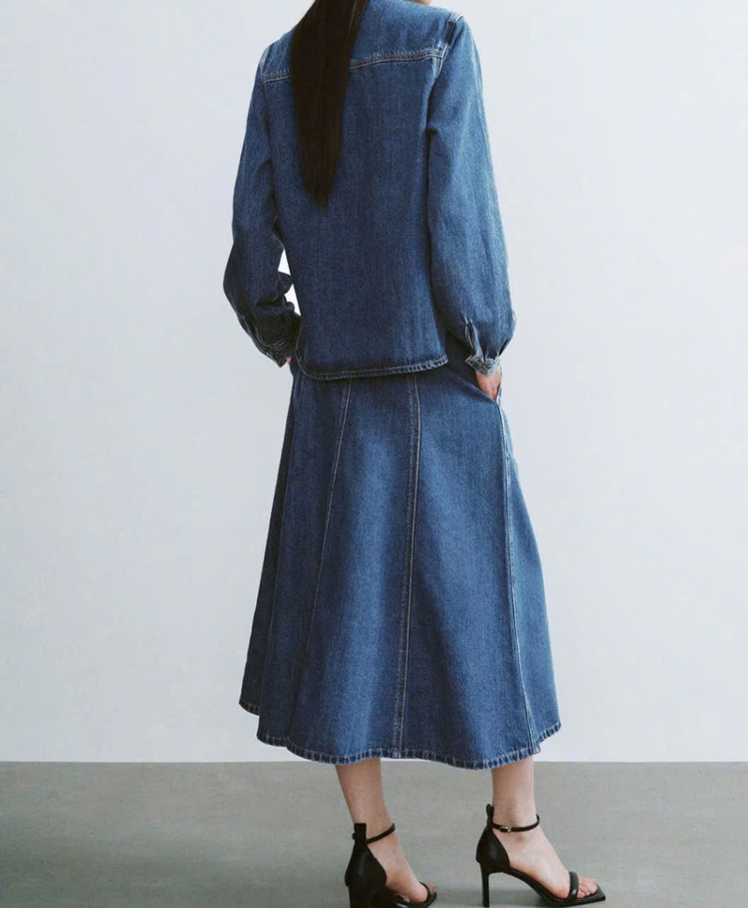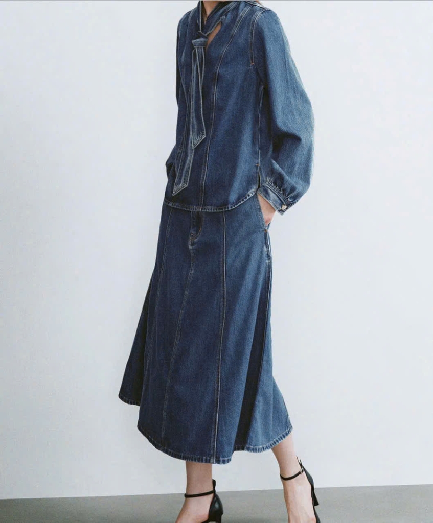 Chân váy jean dài 88-92cm, midi dễ mặc dễ phối cả nhà ơi.