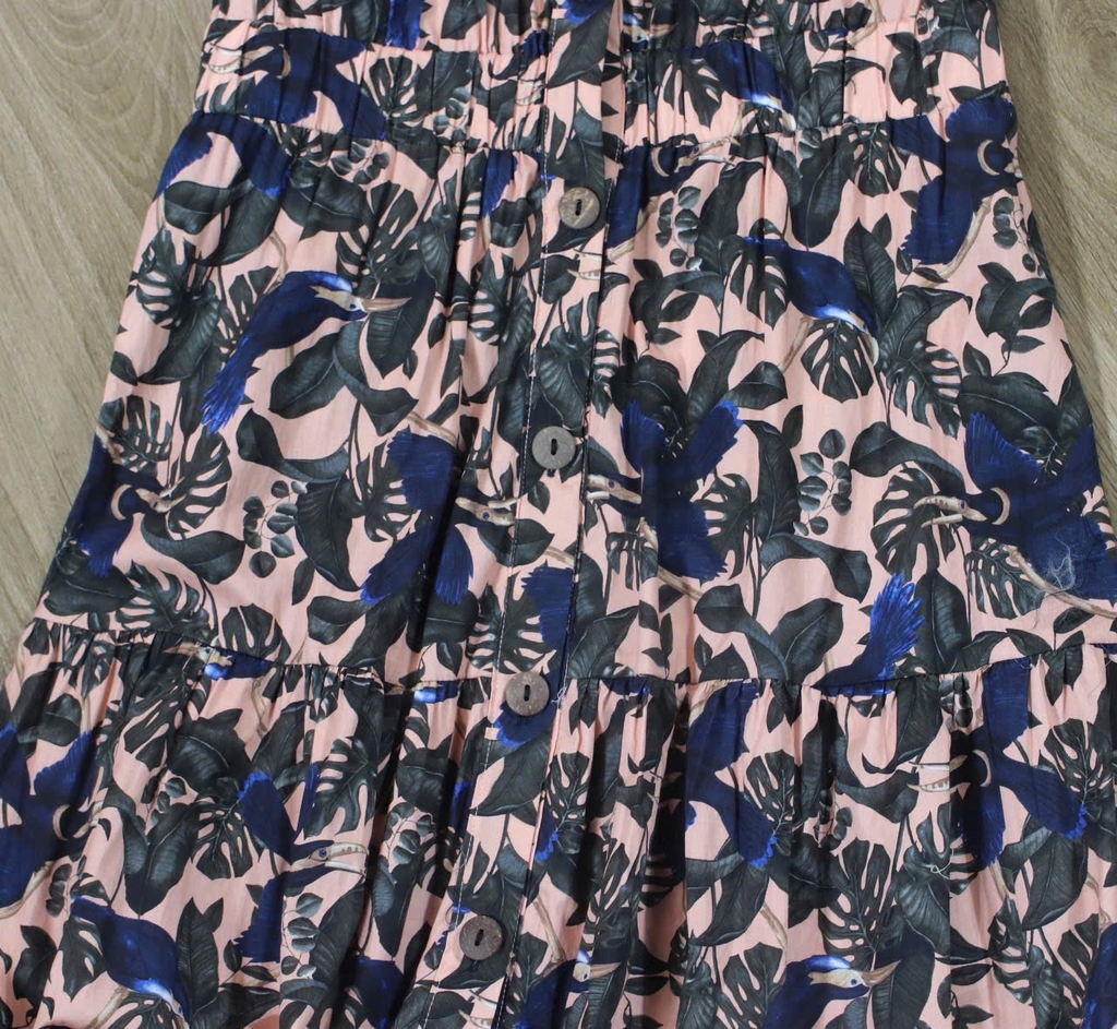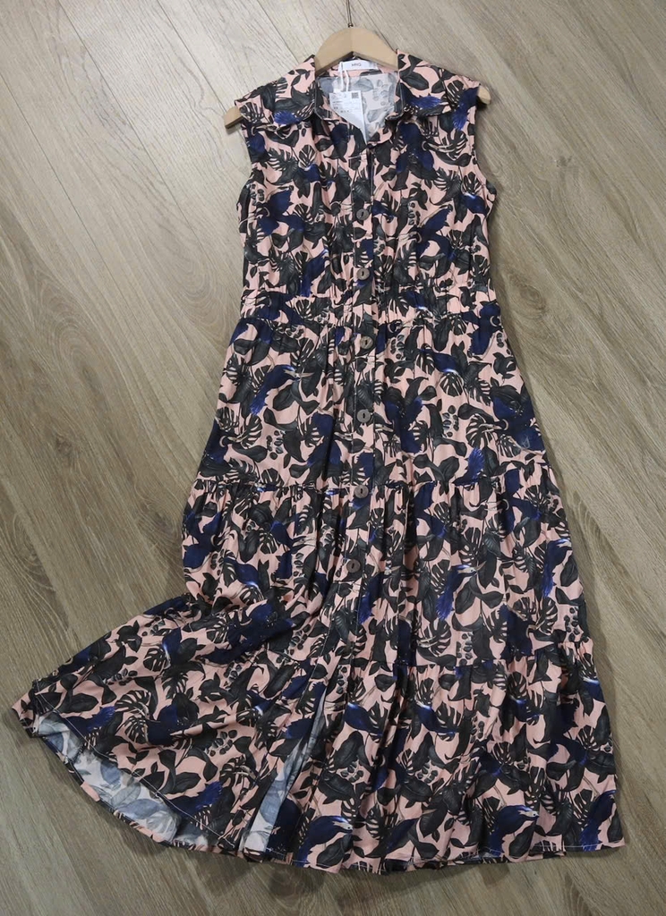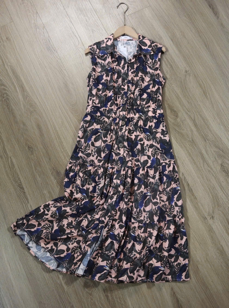 Đầm MNG dáng midi, hoạ tiết hoa lá xinh nè cả nhà, mặc dễ chịu, chất kiểu thô lụa mềm mát. Cài nút thật phía trước, bo chun nhẹ ở eo, tùng nhấn tầng xinh, cổ sơ mi mặc xinh. Dài 112cm.